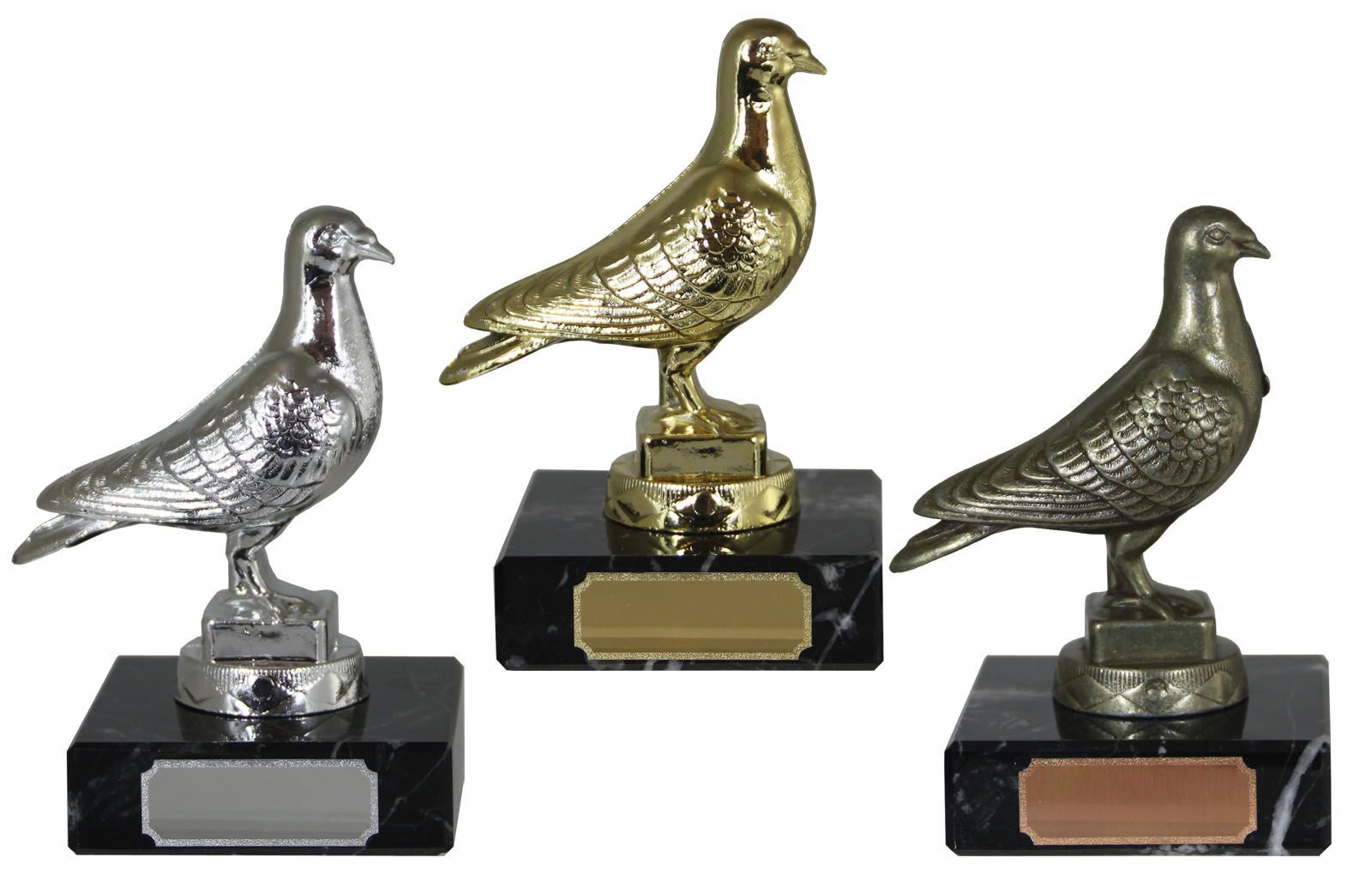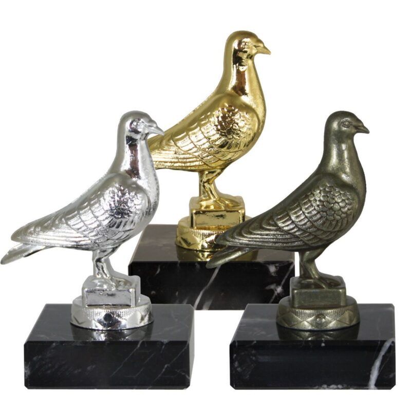 Fugl metallfigur på sort marmorsokkel.