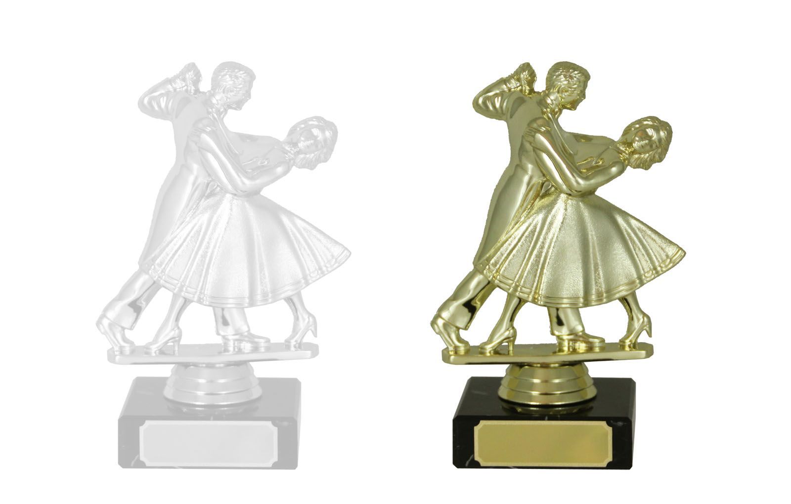 Dansepar støpt i hardplast på sort marmor sokkel. Høyde 15 cm. Gull og sølv valør. Gravering gjøres på sokkelen.