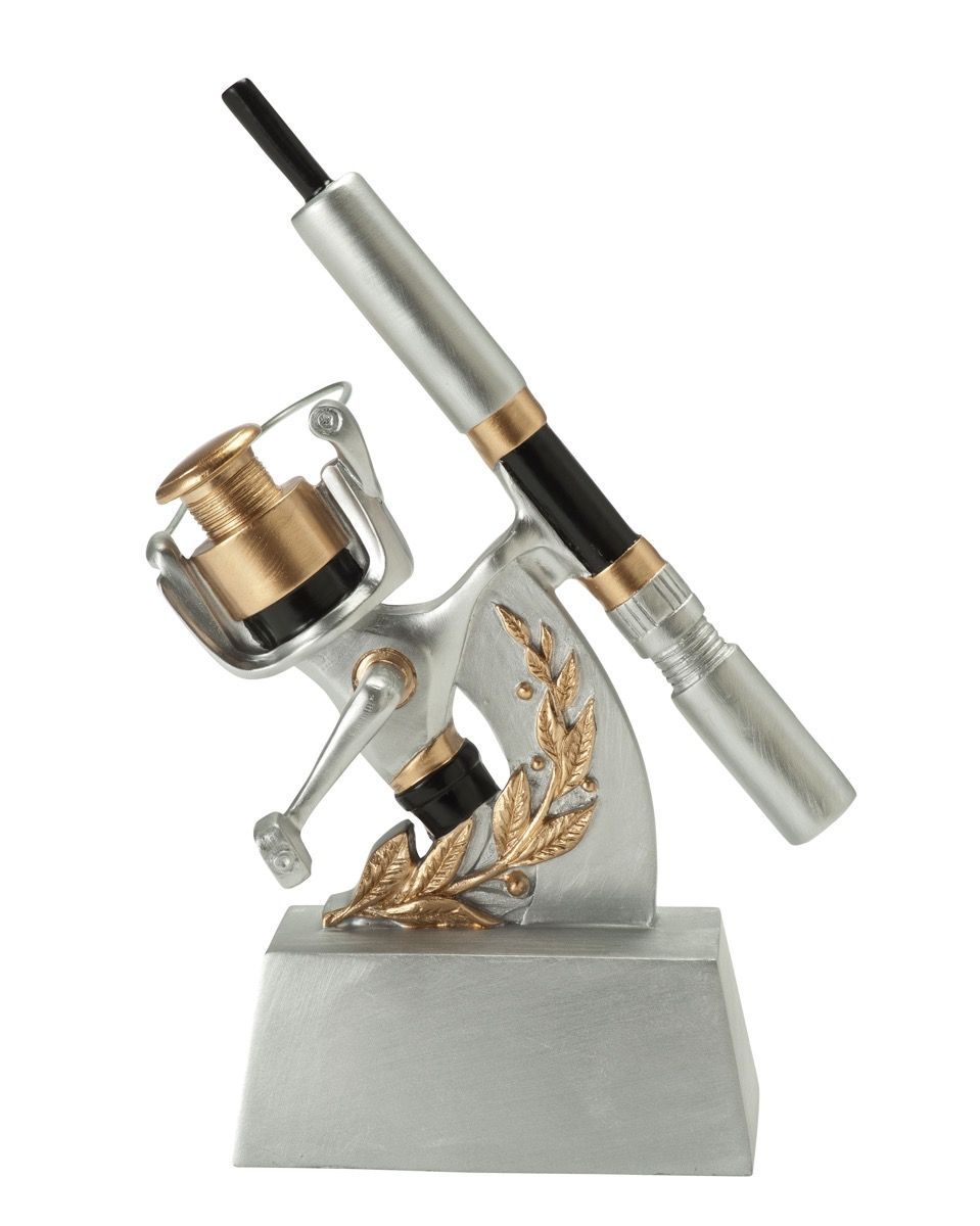 Fiskestang-statuett i sølvvalør med gull- og sorte detaljer. Statuetten er helstøpt i resina. Flott statuett med noe tyngde.