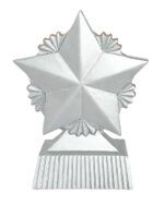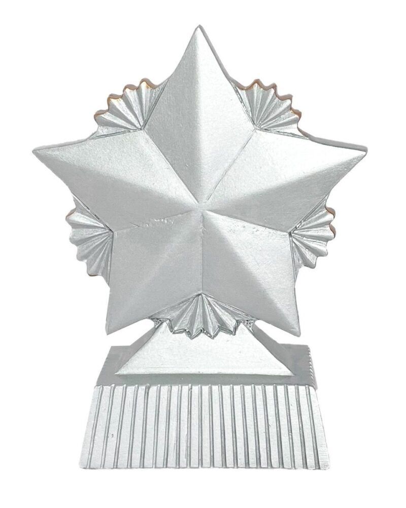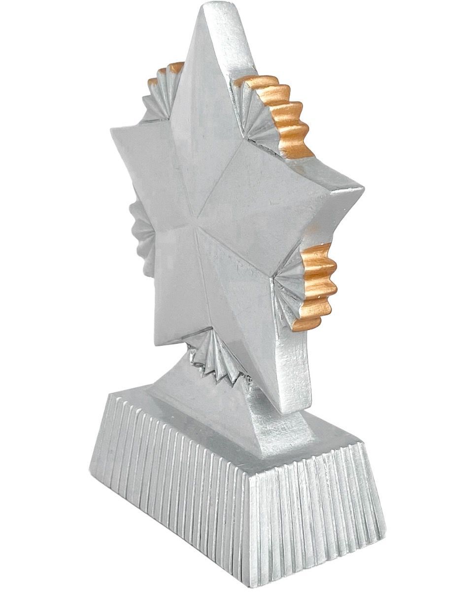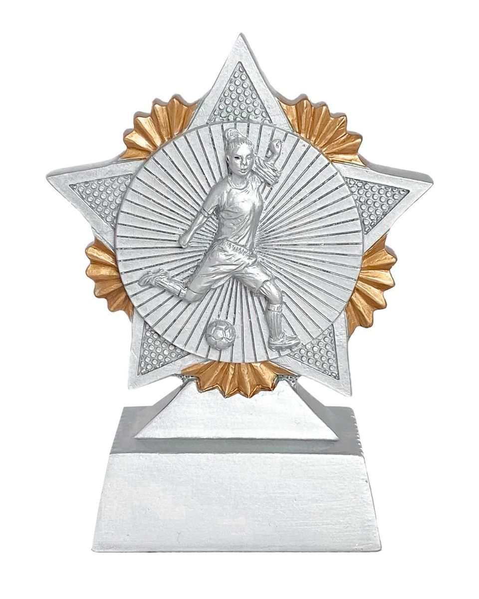 Fotballstatuett helstøpt i resina sølvvalør med gull-detaljer.