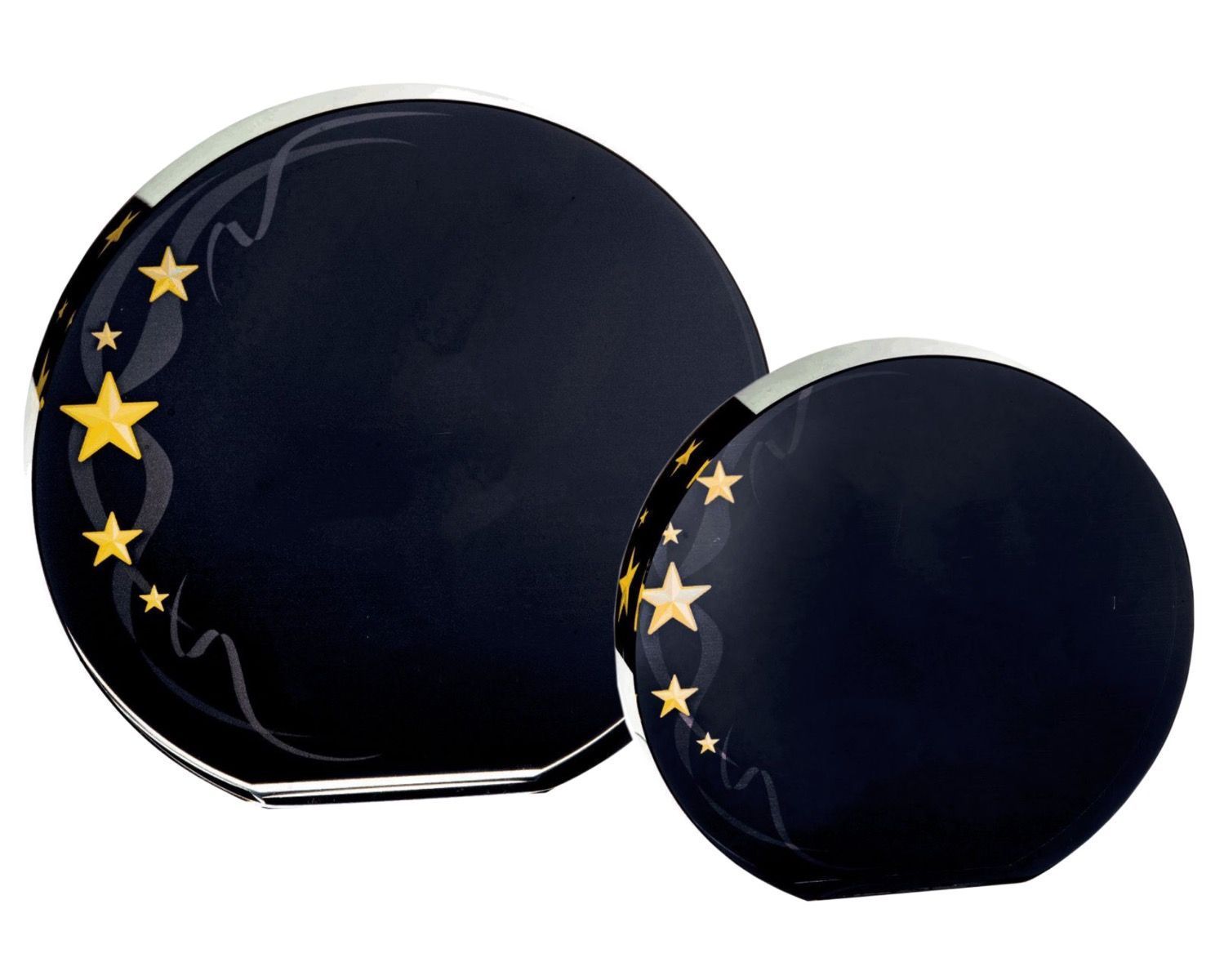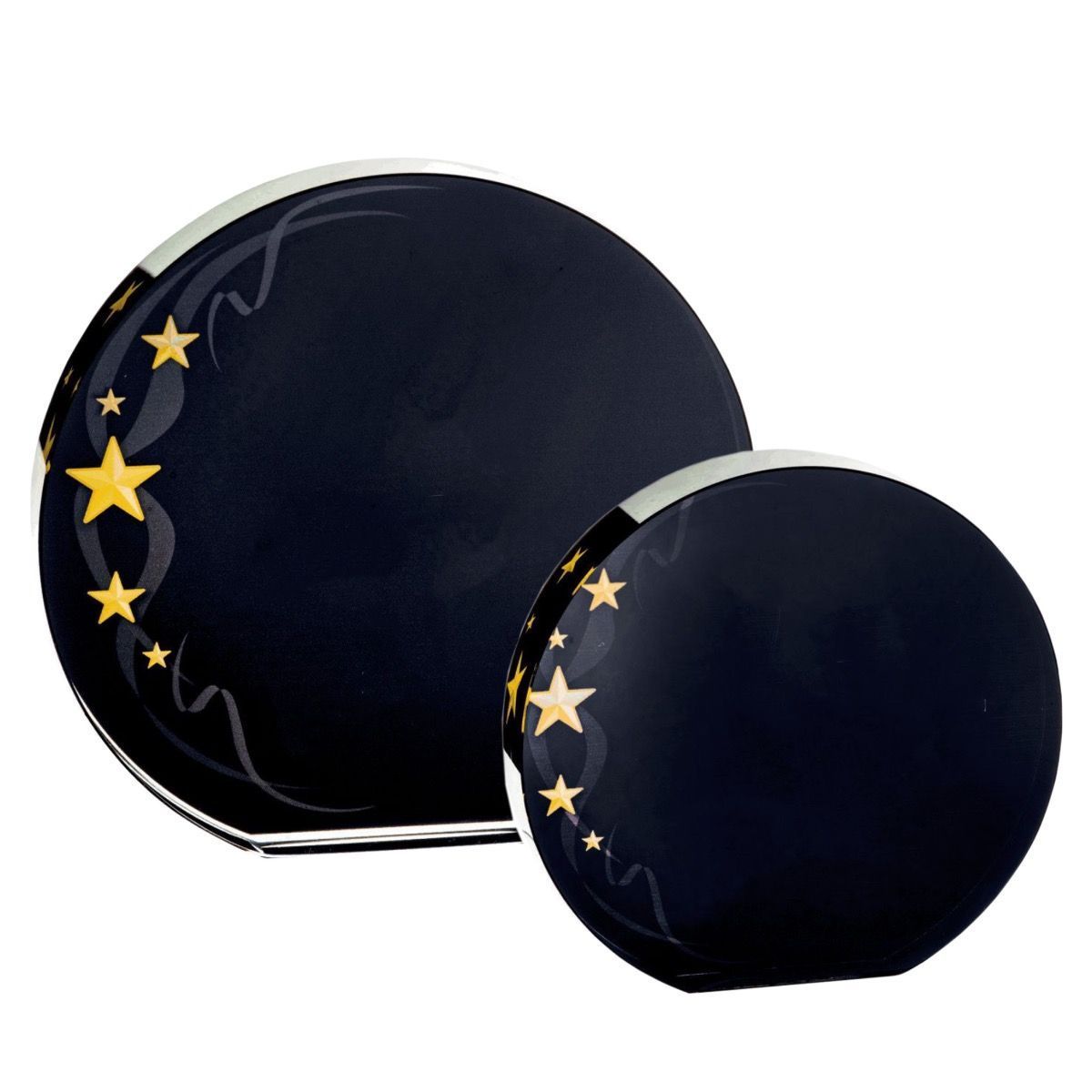 Sort glassplakett med stjerner.
