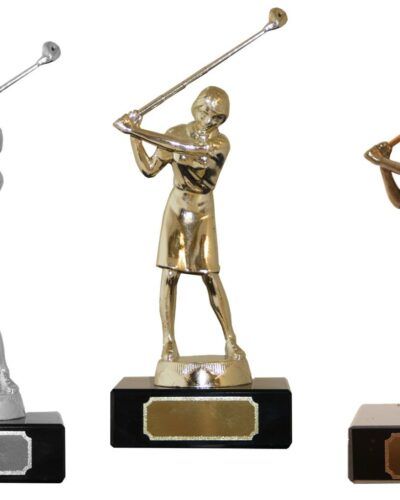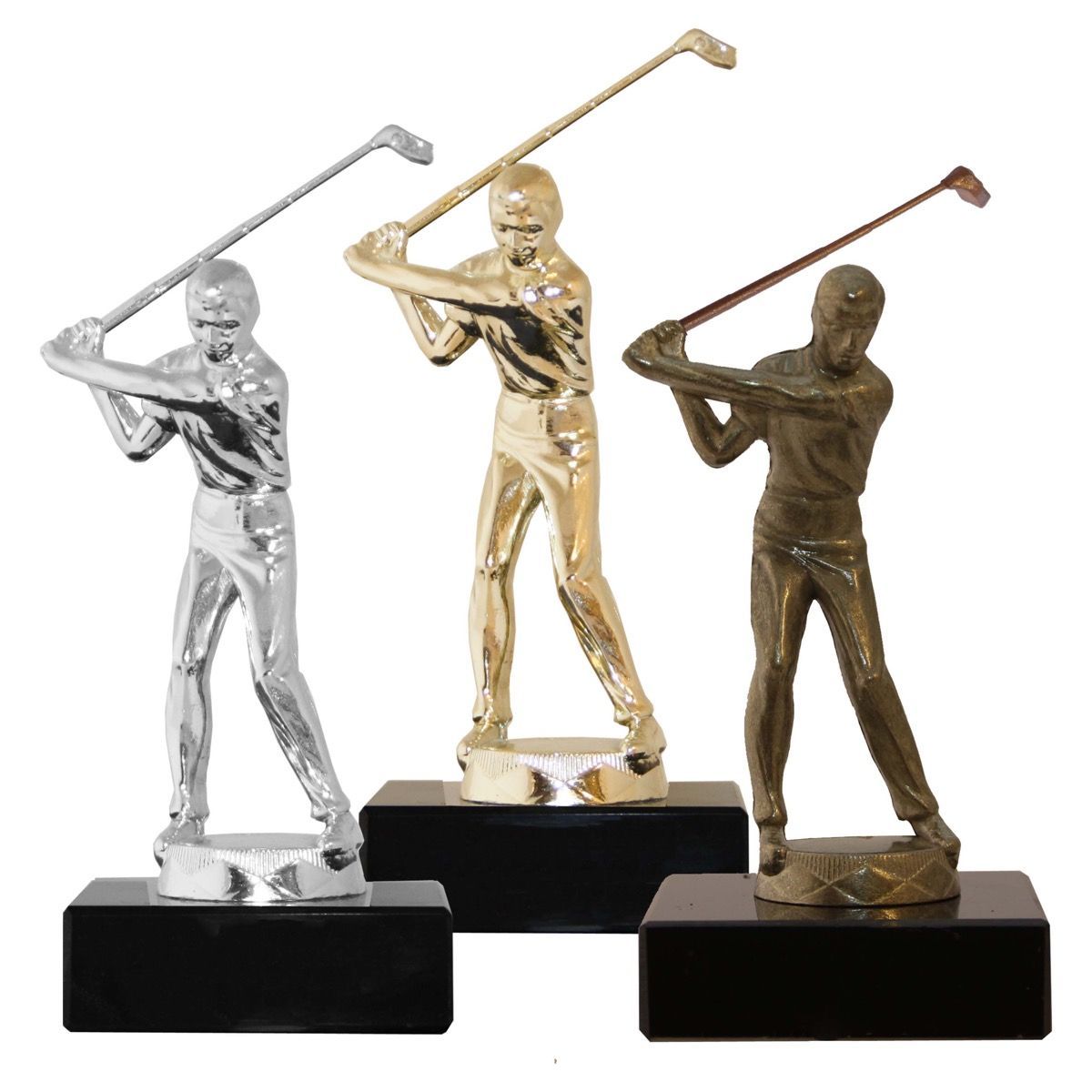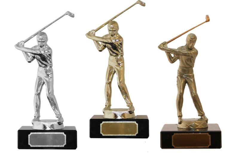 Golf herrefigur i metall.Graveringsplate på sort marmorsokkel.