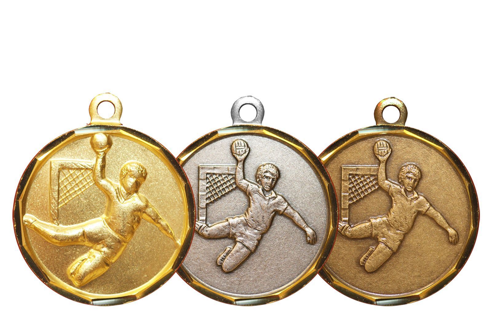 Håndballmedalje i messing.Størrelse: 32 mm i diameter.
