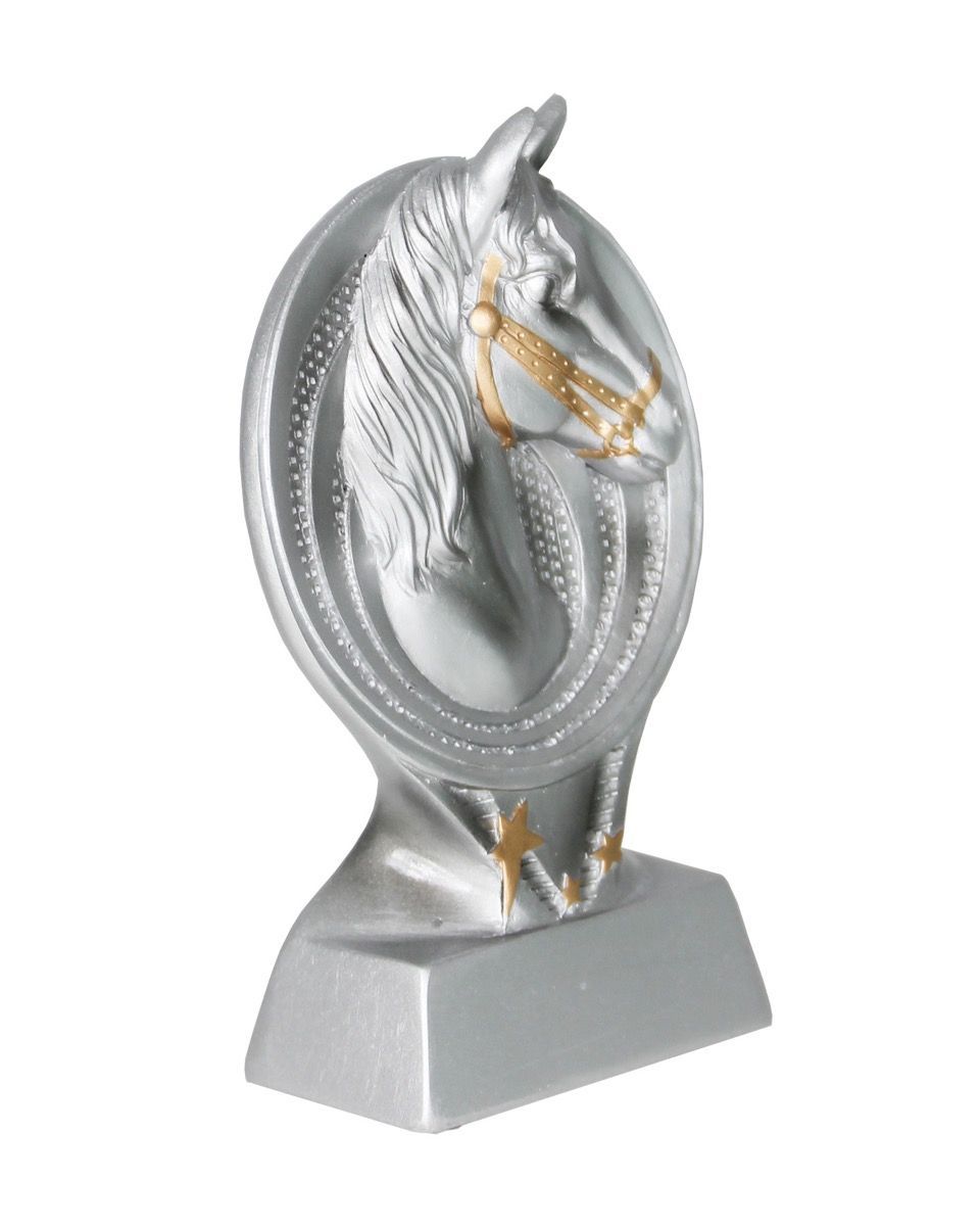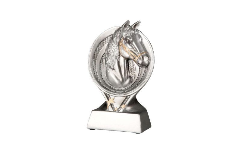 Hestehode statuett støpt i resina. Høyde 15 cm. Flott premie. Gravering gjøres på sokkelen.