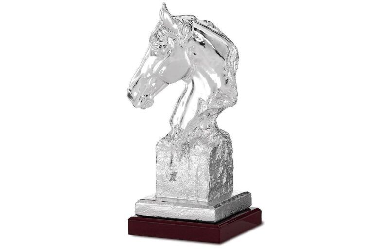 Flott skulptur av et hestehode i sølvvalør. Helstøpt i resina på tresokkel. Kan gravere tekst på graveringsplate i sølvvalør.