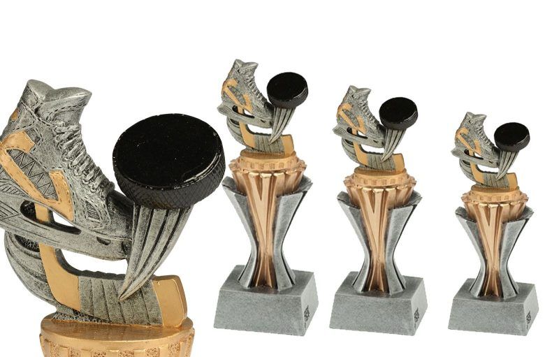 Hockey-statuett støpt i resina med fine detaljer.