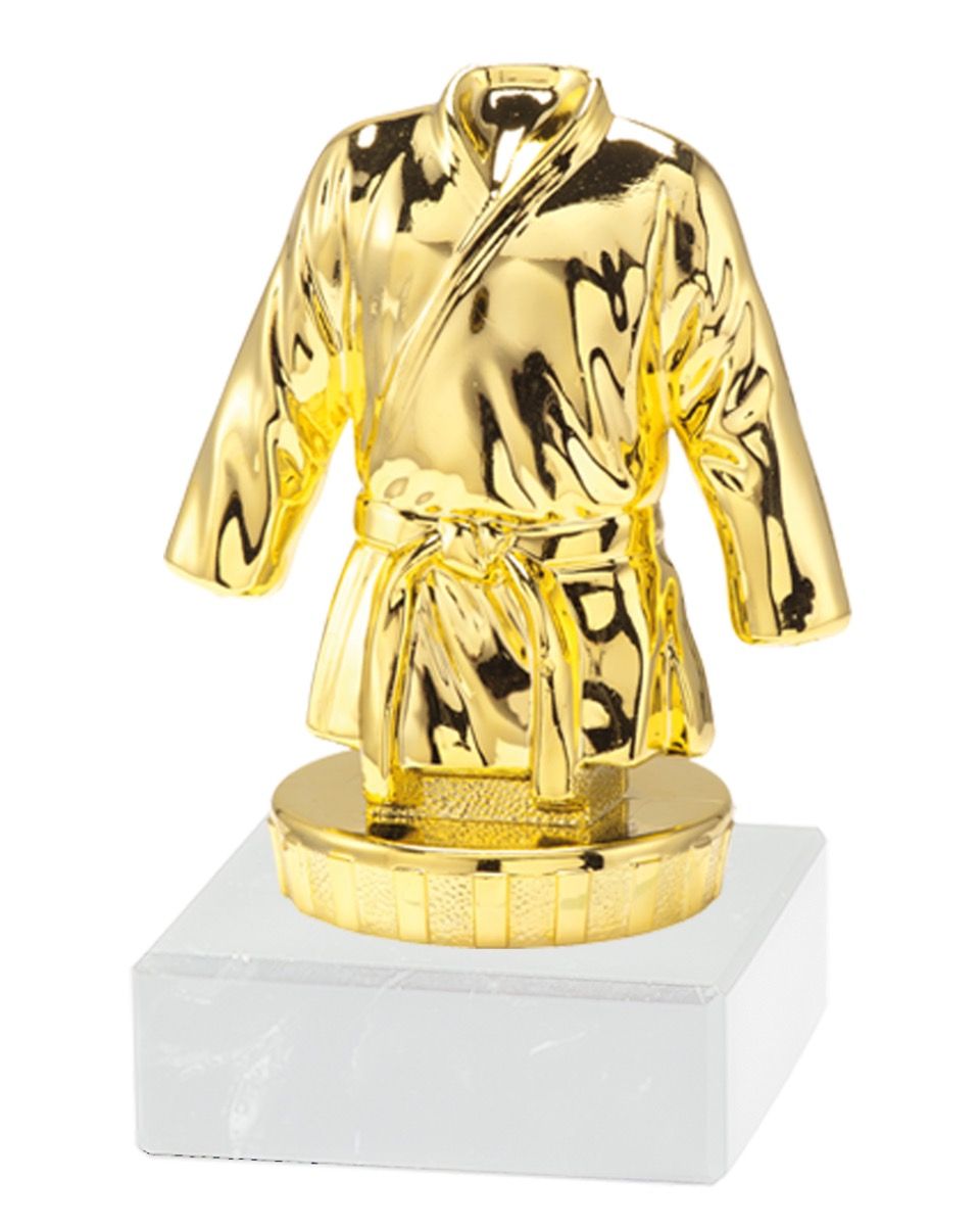 Kampsportstatuett i hardplast på hvit marmorsokkel.