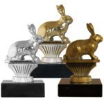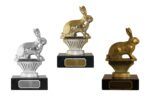 Kanin metallfigur på sort marmorsokkel. Høyde 11 cm. Gull, sølv og bronse valør.