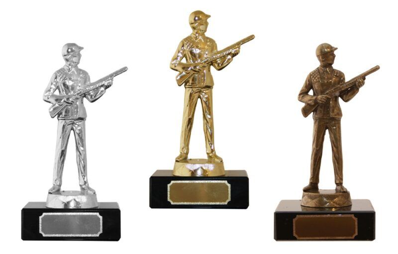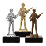 Lerdue skytter metallfigur på sort marmorsokkel. Gull, sølv og bronse valør.