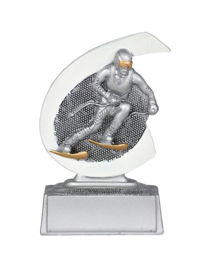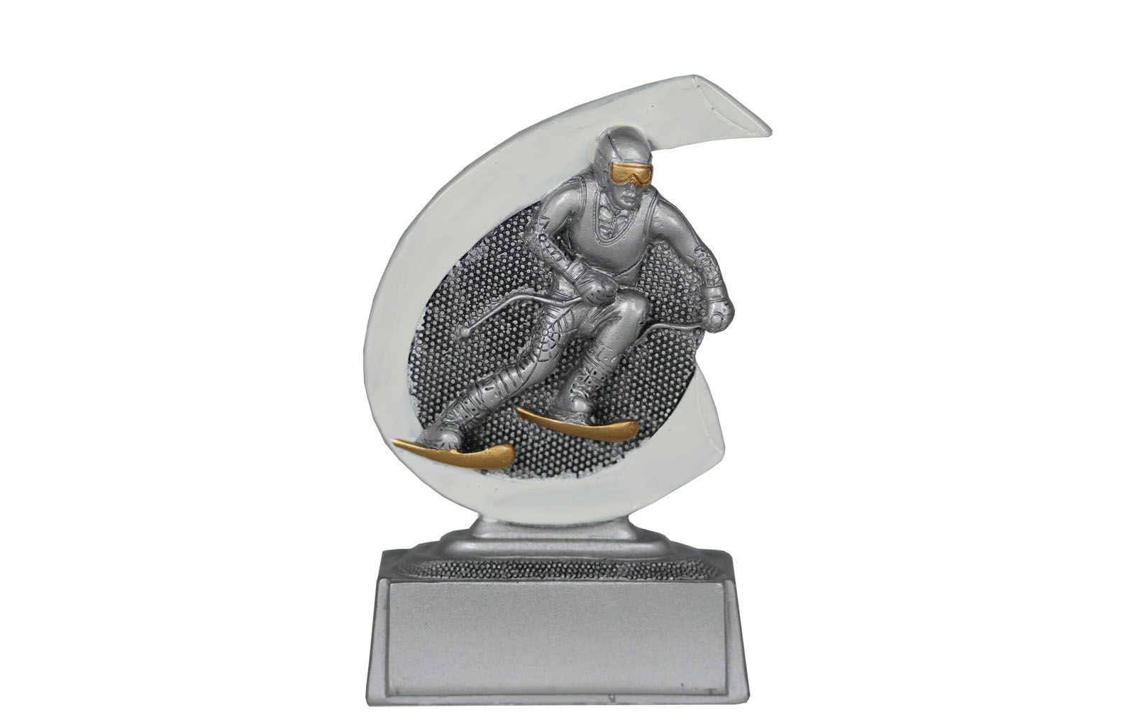 Alpin-statuett støpt i resina.Sølvvalør med gulldetaljer. Under 550 igjen på lager.