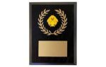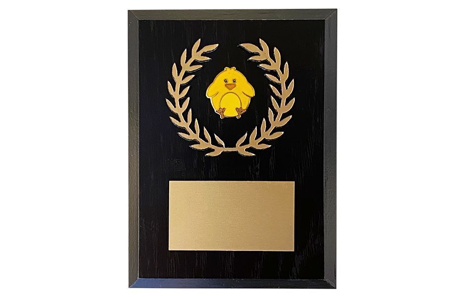 Liten treplakett med påskekylling-motiv med krans rundt. Plaketten kommer i gullvalør og kan graveres med egen tekst på graveringsplaten.