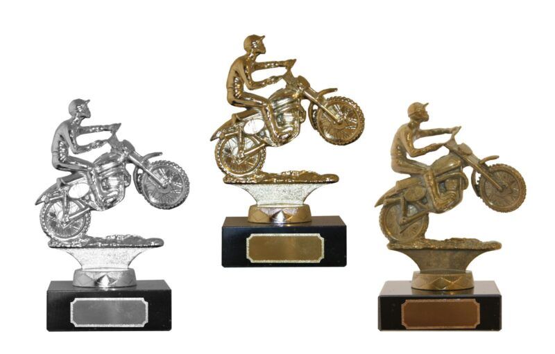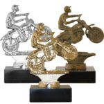 Motor sykkel metallfigur på sort marmorsokkel. Gull, sølv og bronse valør.
