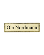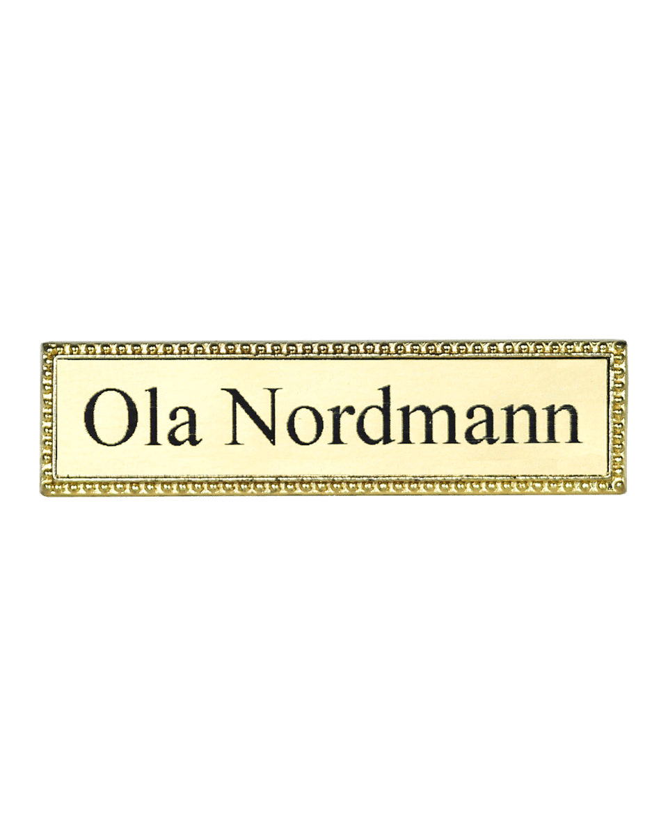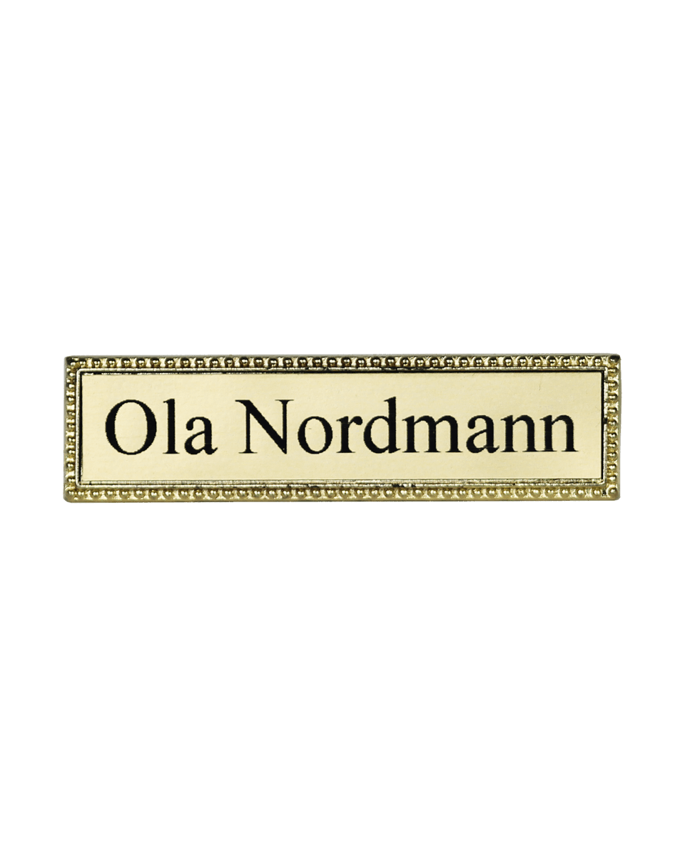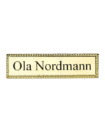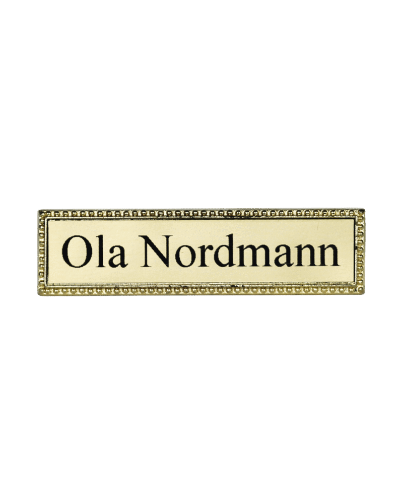 Flott navneskilt i metall. Skiltene er i gullvalør og kan leveres med navn.
