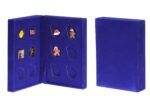 Pinsboks heltrukket i velour. Kommer i en sterk blåfarge. Plass til opptil 12 pins.