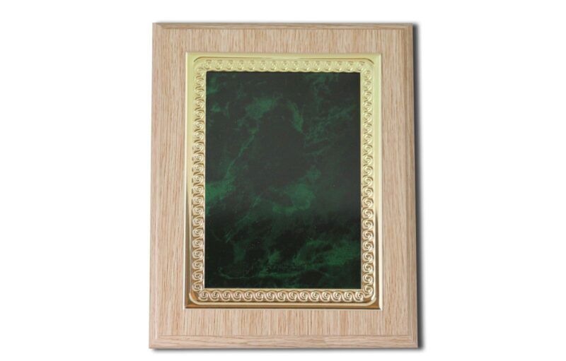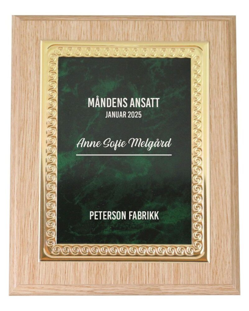 Plakett i lyst treverk med grønn metallfront.