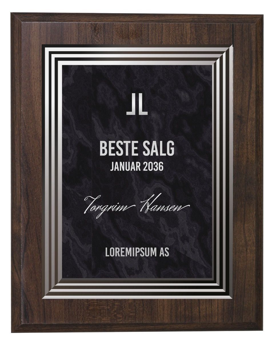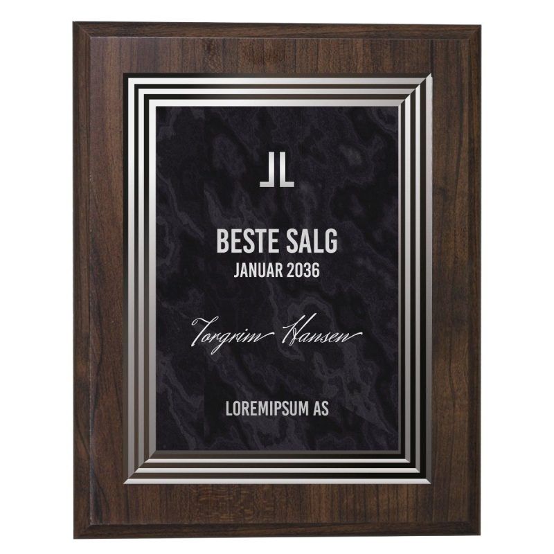 Plakett i solid tre med grå metallfront til å henge på veggen.