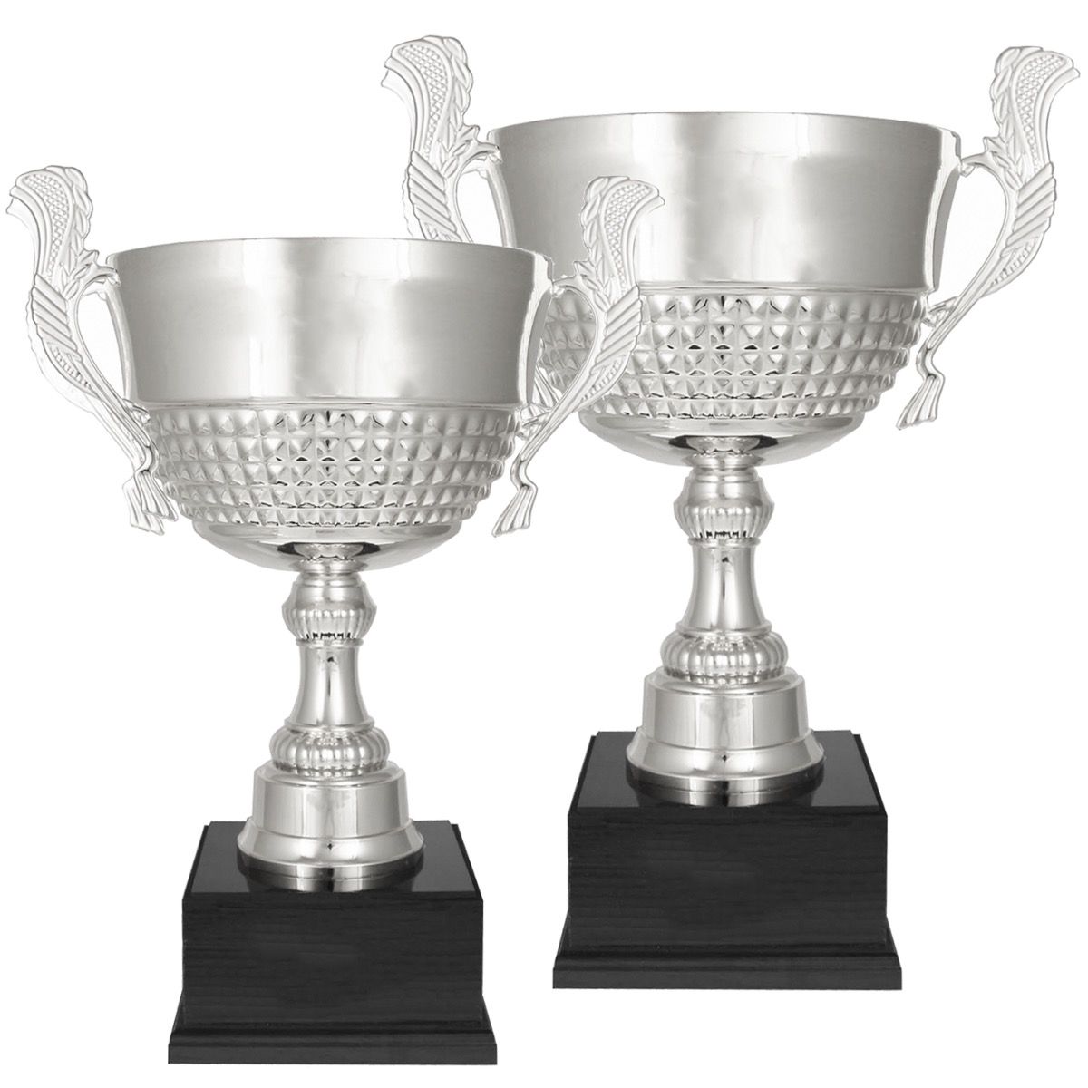 Sølvpokaler med hank i to størrelser.Cup i metall, mellomstykke og sokkel i hardplast.Flotte, store pokaler til premieskapet.