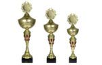 Topp og cup i metall og mellomstykke i hardplast. Pokalene er montert på sort marmorsokkel.