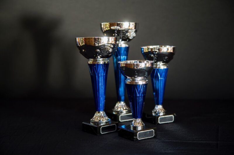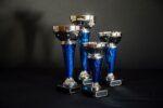 Sølvpokaler med blå detaljer