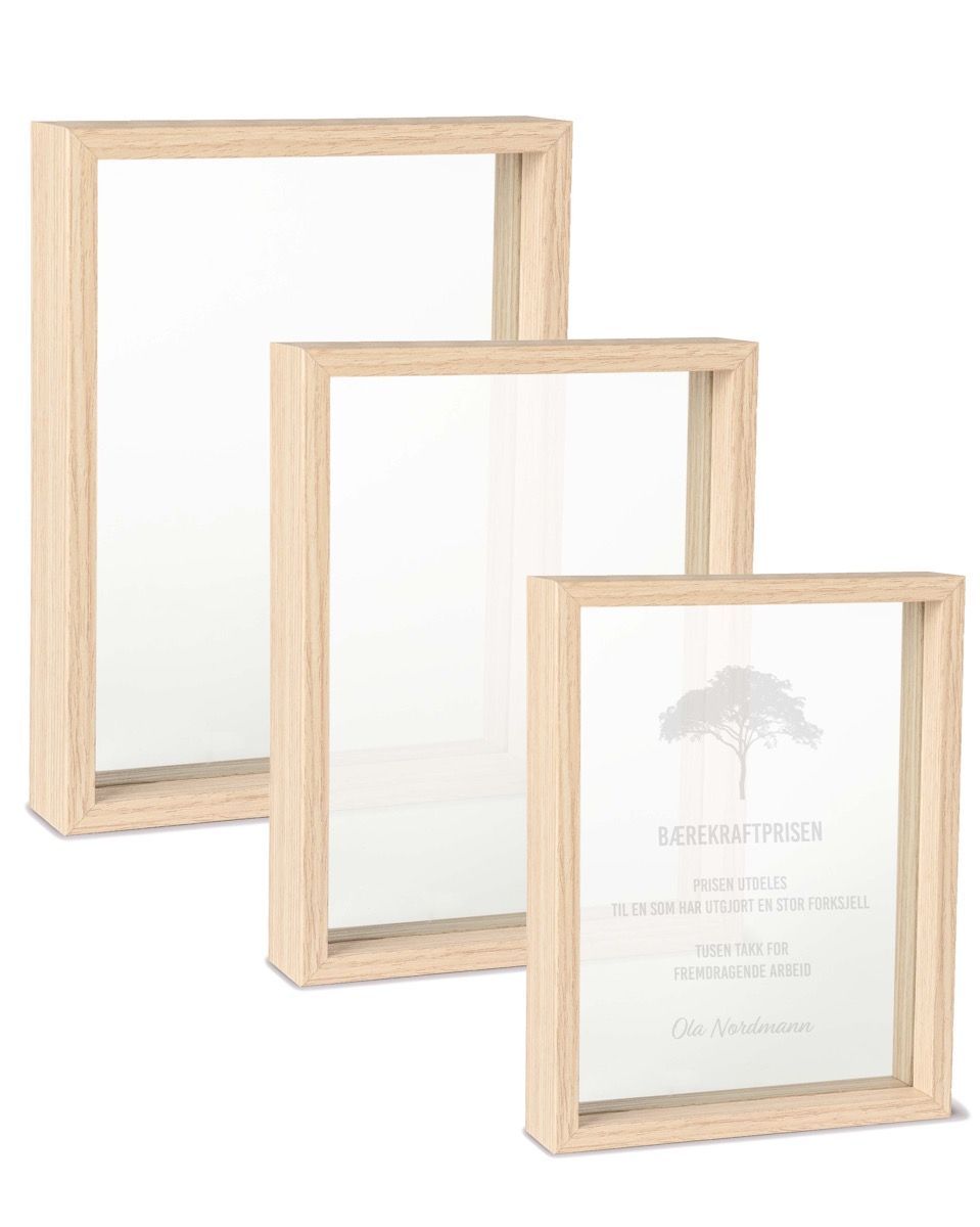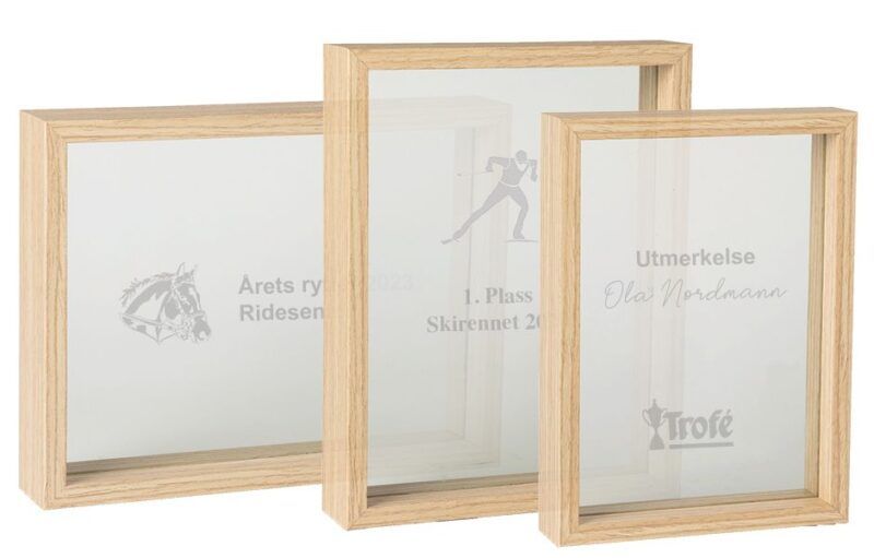 Glassplakettene med treramme rundt er kjempestilige plaketter som kommer i 3 størrelser. Super å ha ståene på hylla, eller henge opp på veggen! Kan lasergraveres med logo/motiv og tekst på.