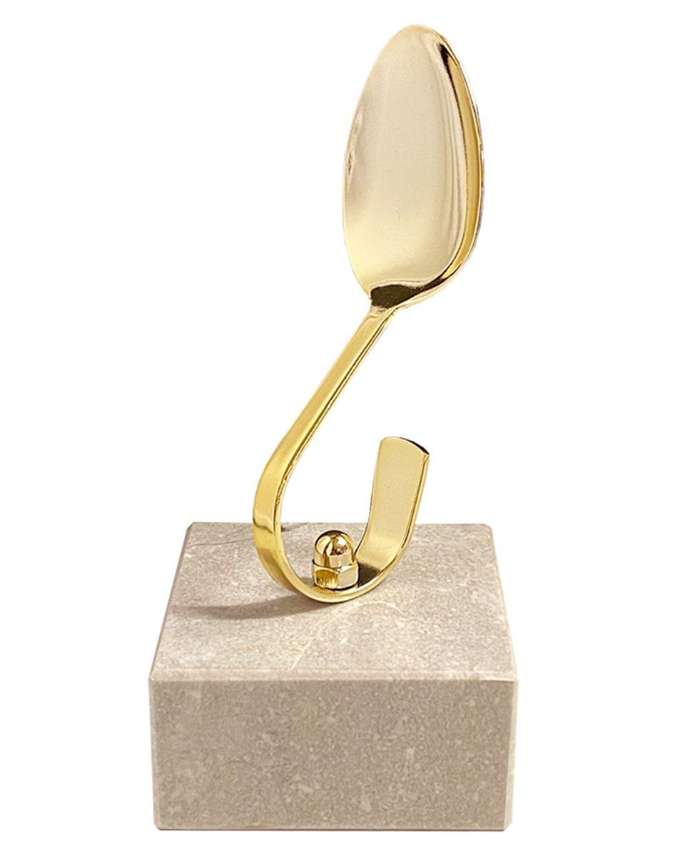 Stilig bøyd metall-skje i gullvalør. Kul premie, til den som er født med gullskje i munn, flink kokk eller en matguru. Skjeen er montert på lys marmorsokkel.