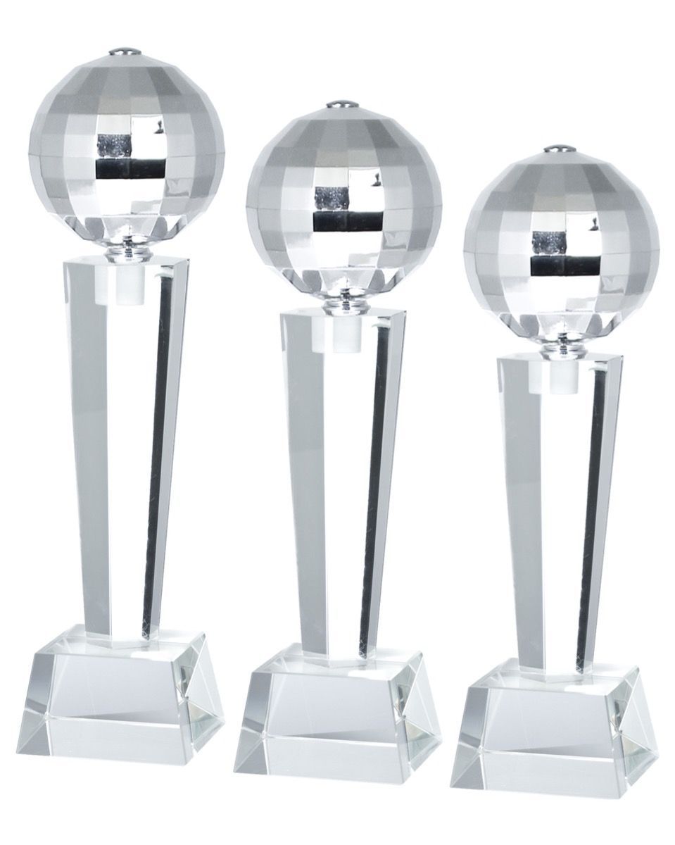 Krystallstatuett i glass med discokule som motiv i toppen. Discokula er støpt i hardplast. Teksten graveres på plate som festes på sokkelen. Råflott premie til heldige vinnere.
