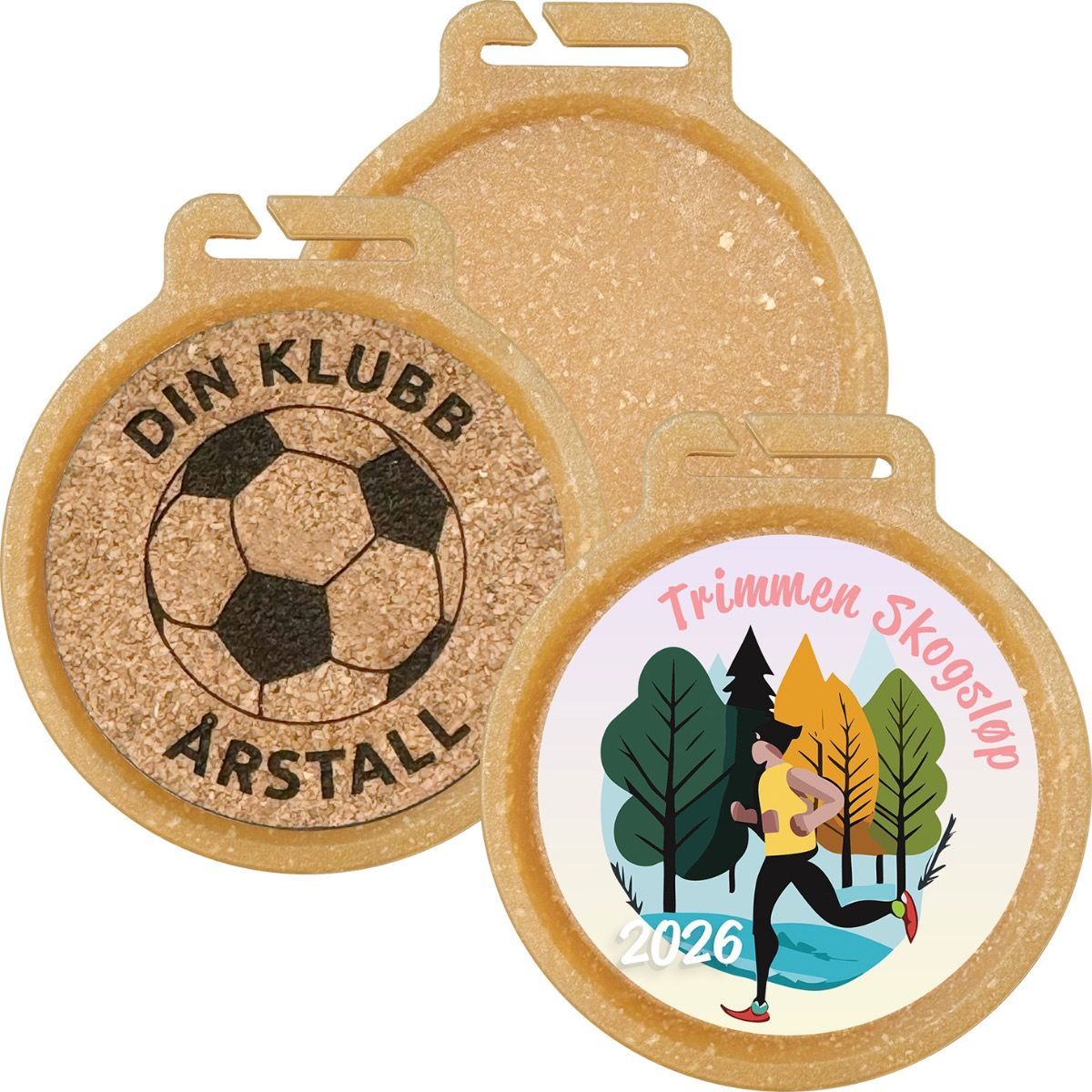 Kombiner de resirkulerte plastmedaljene med kork, klistremerke, metallmotiv, for å gjøre medaljene helt unike til ditt arrangement.
