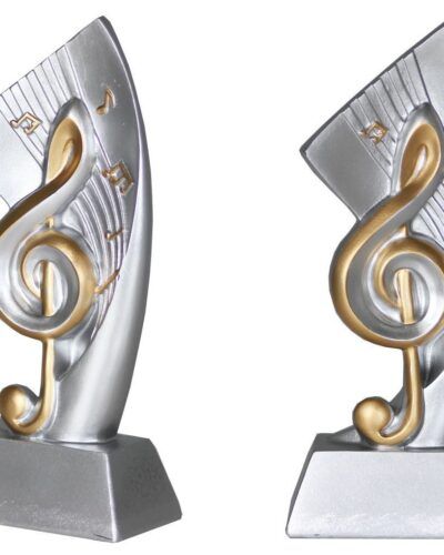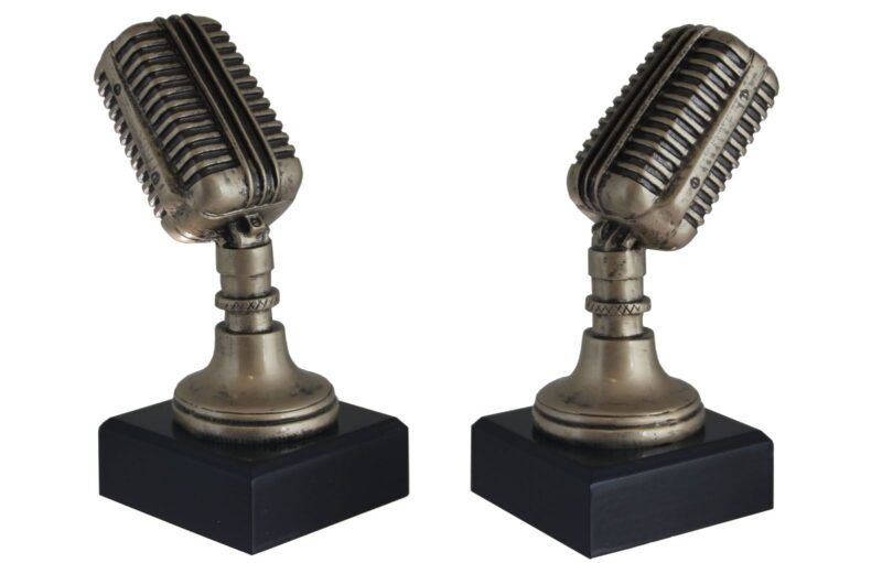 Mikrofon støpt i resina – antikk gull valør. Graveringsplate festes på tresokkelen.