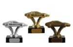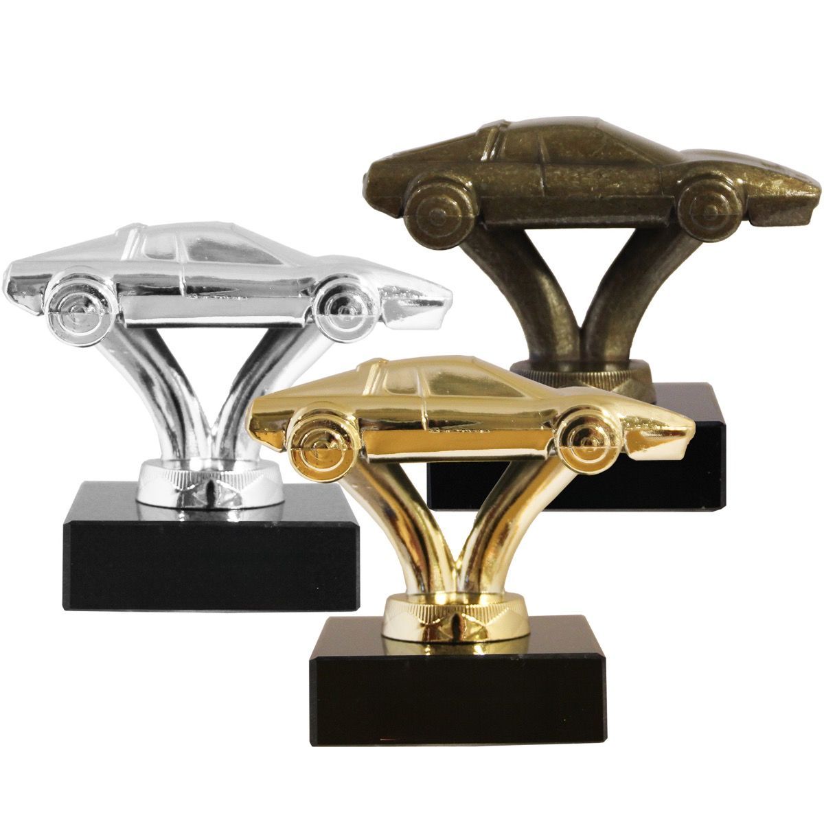 Bil metallfigur på sort marmorsokkel. Gull, sølv og bronse valør.