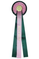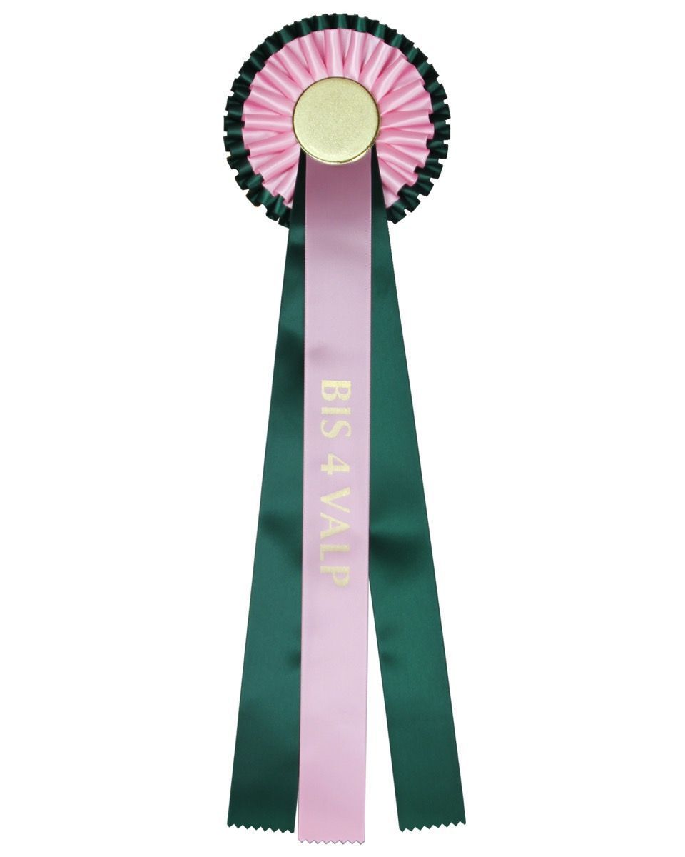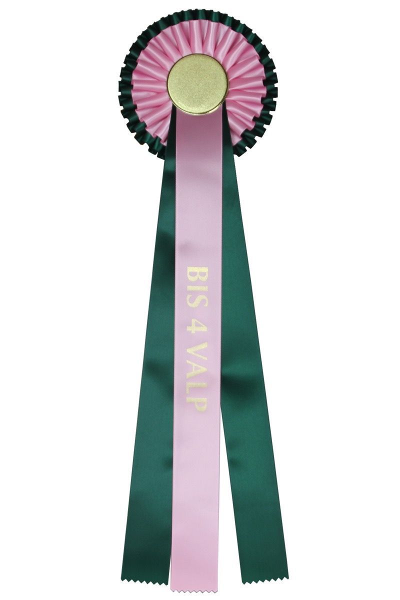 Rosetter til best in show-valper. Kan leveres med egen logo! Lasergravert logo på metall fra 1 stk – Klistremerke i farger fra 100 stk.