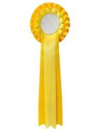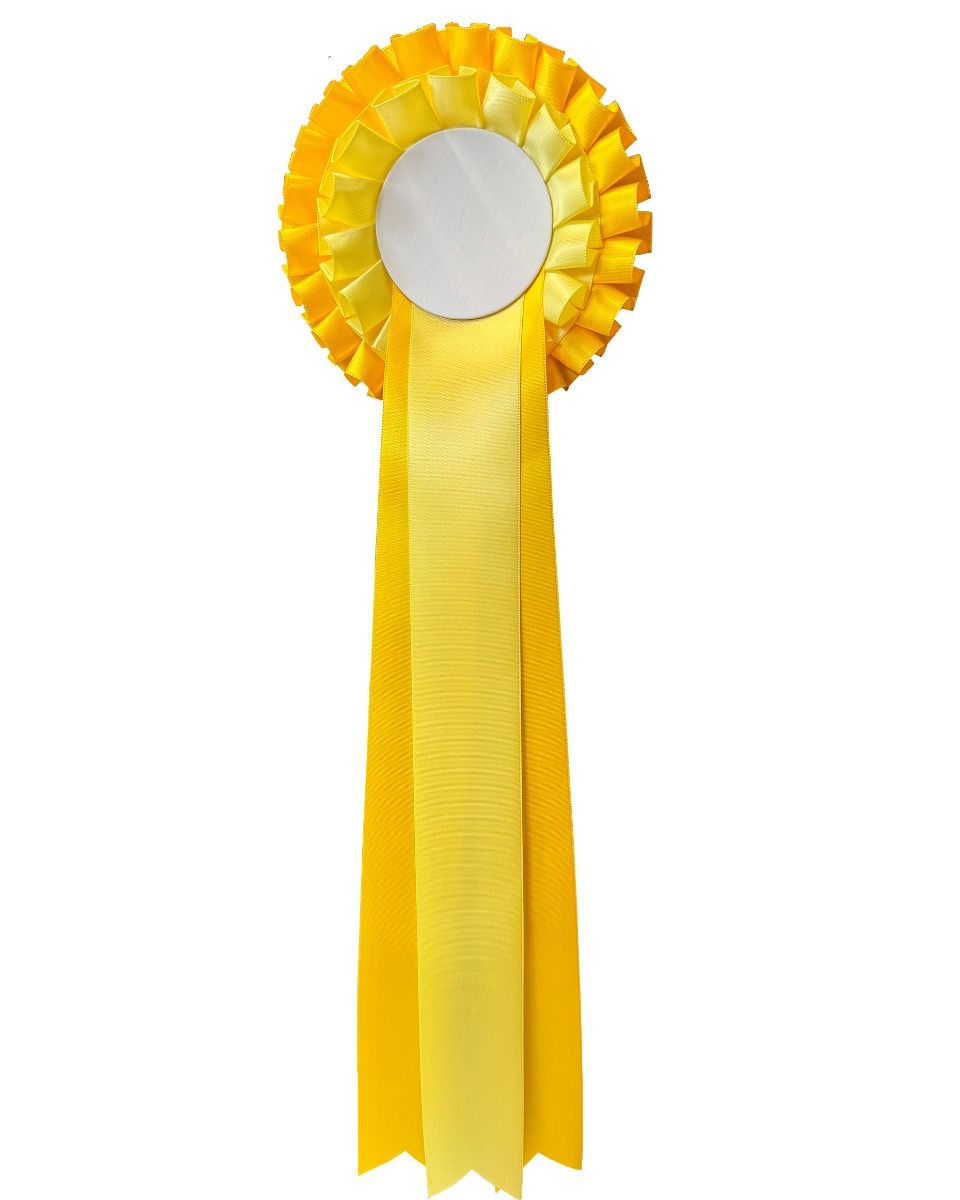 Flott rosett med 3-lags bånd og 2 kranser. Kan graveres med egen logo og eller tekst i senterfeltet.