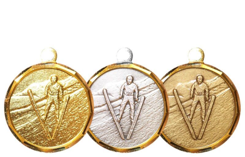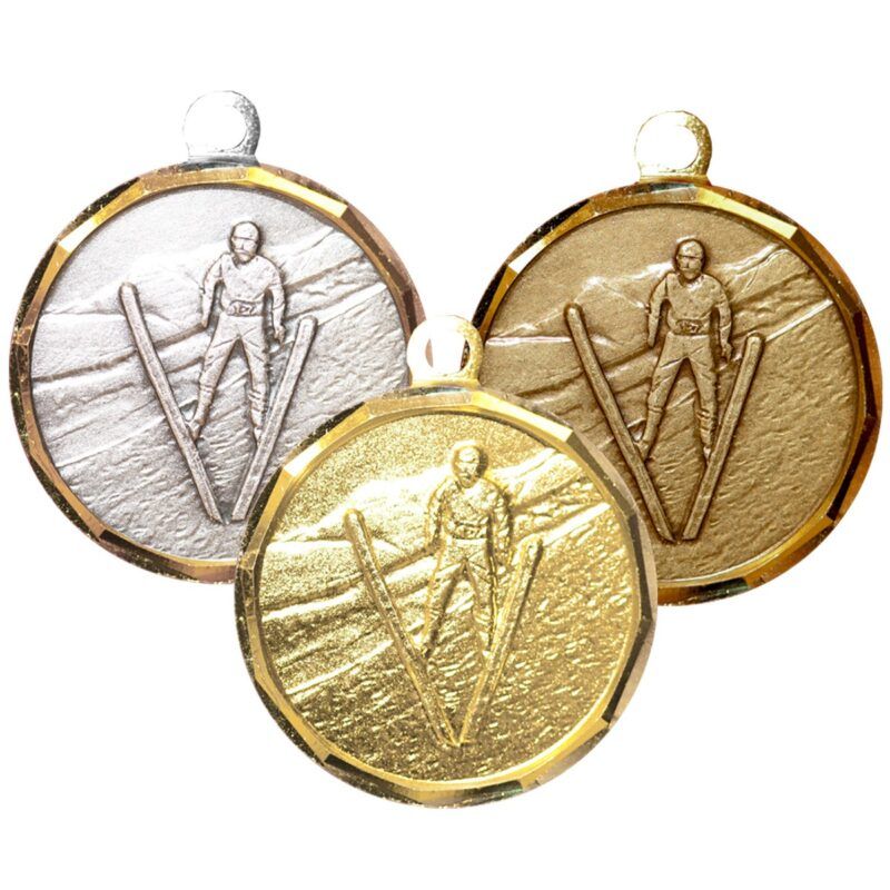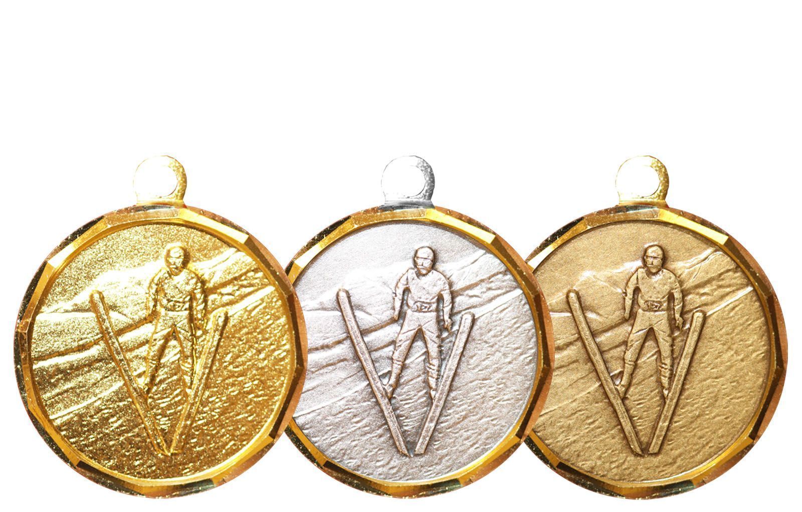 Skihopp-medalje i gull-, sølv- og bronse-valør.