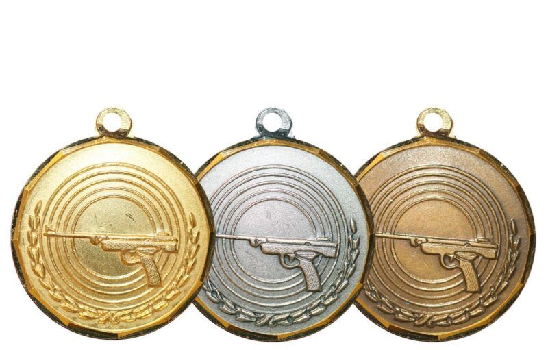 Luftpistol-medalje i messing – 32mm i diameter.