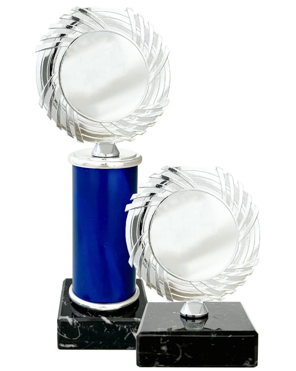 Statuett i sølvvalør med blå detaljer.Marmorsokkel og metall topp.Mellomstykke på største i hardplast.