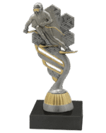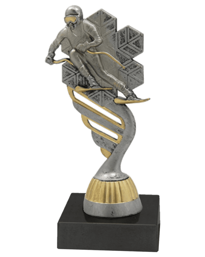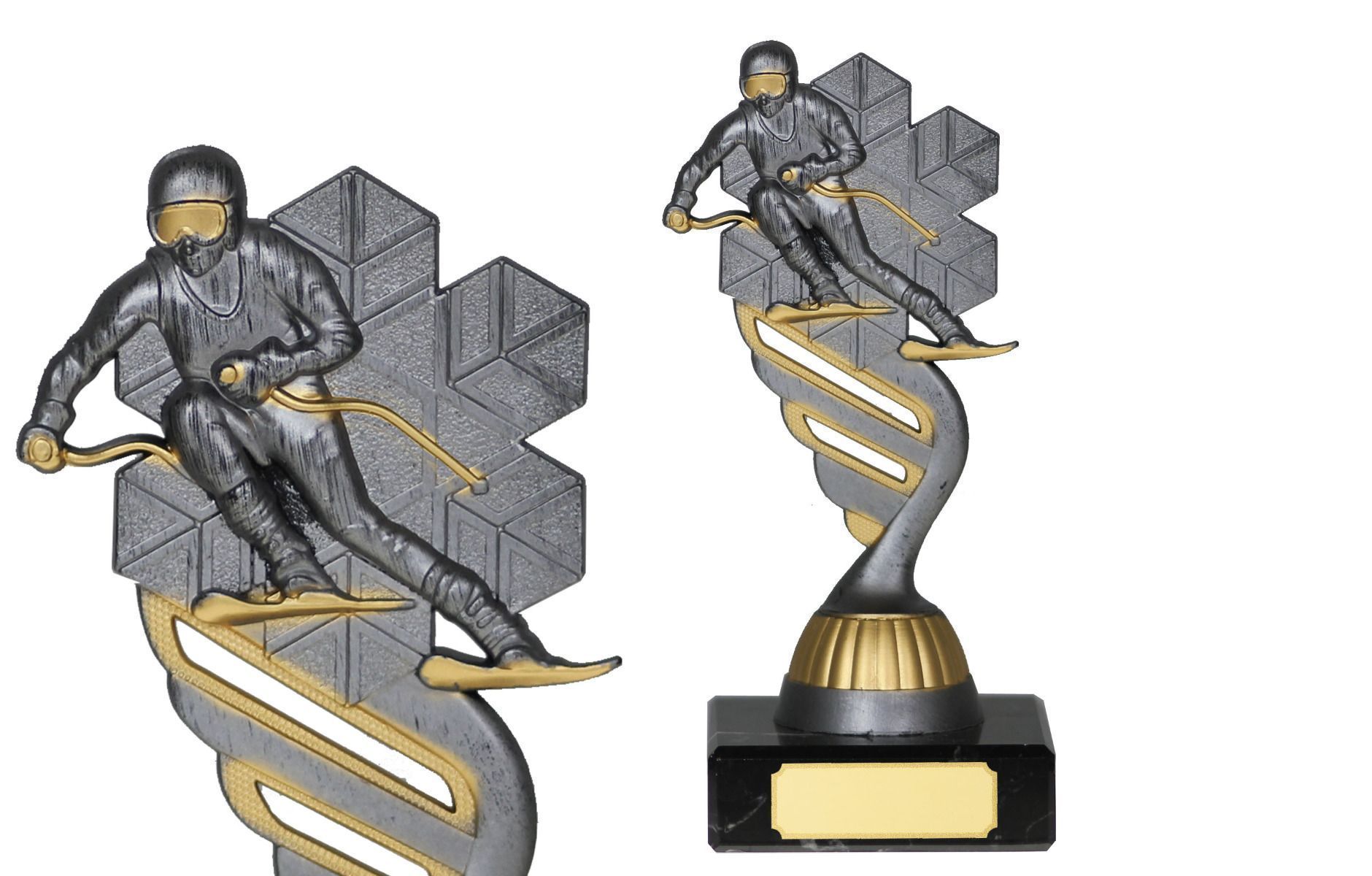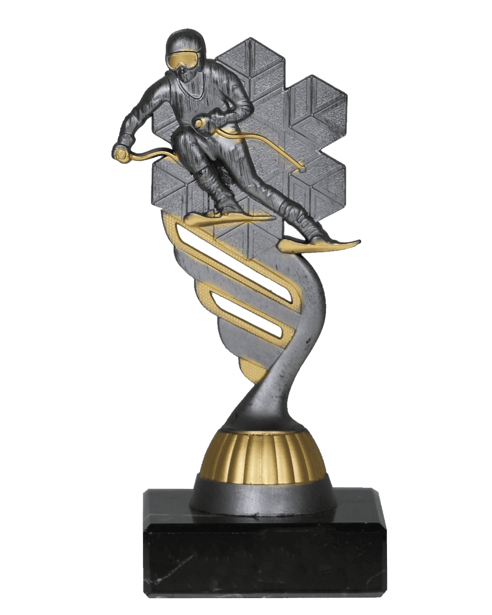 Alpin-statuett i hardplast på sort marmorsokkel.