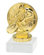Sykkelstatuett i hardplast på hvit marmorsokkel.