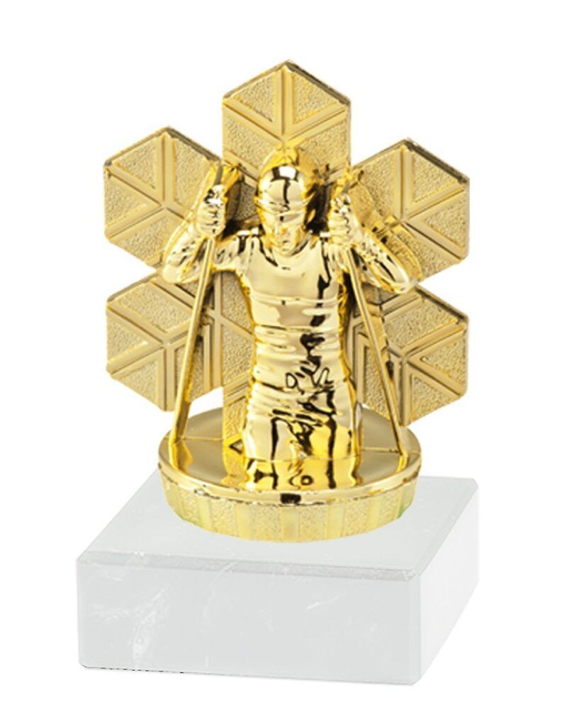Langrennstatuett i hardplast på hvit marmorsokkel.