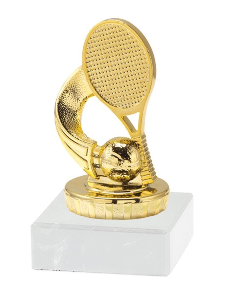Tennisstatuett i hardplast på hvit marmorsokkel.