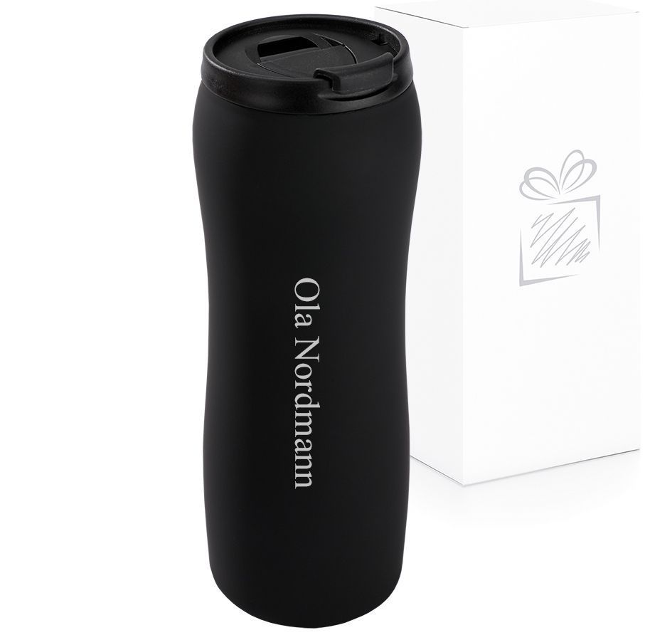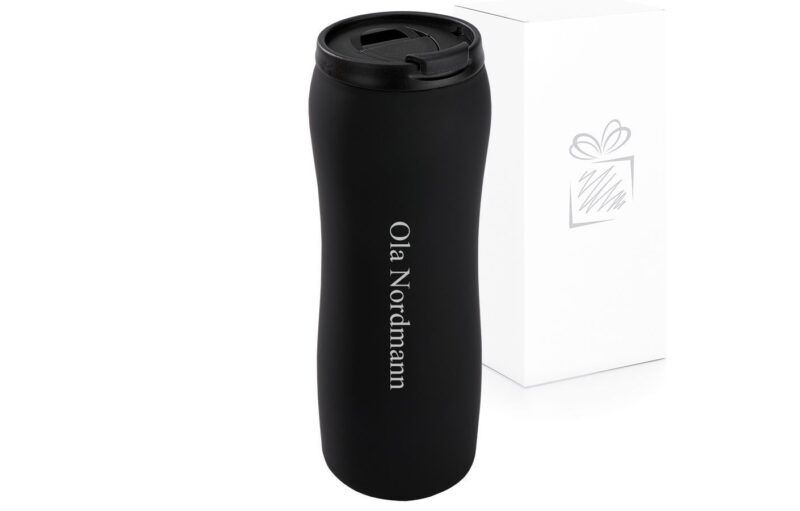Stilig termokopp i rustfritt stål med gummi-belagt finish, som gjør koppen myk og god å holde i. Superfin å lasergravere på, og graveringen kommer fram som stålfarge.