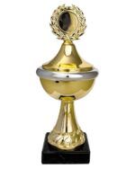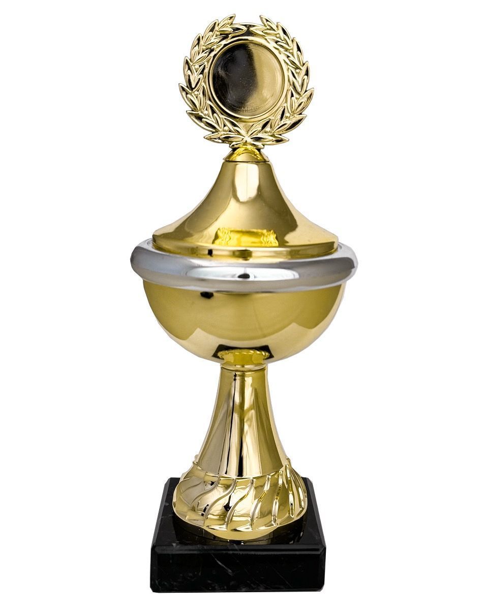 Tilbudspokal i gullvalør med sølv-detaljer.Prisgunstig pokal med plass til motiv.
