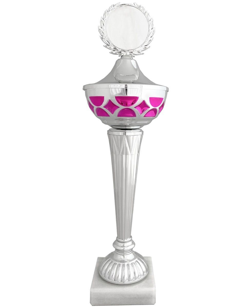 Høy, stilig pokal montert på hvit marmorsokkel.