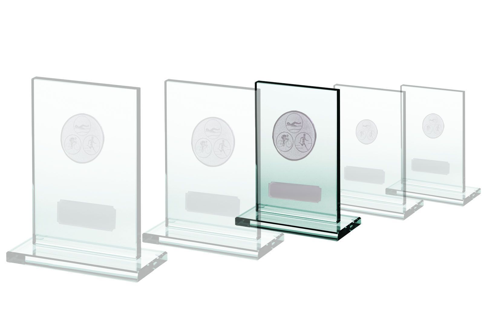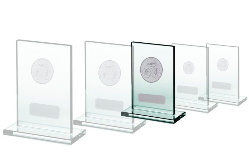 Glass plakett med valg fri idrett eller aktivitet. Høyde 11 cm, 13 cm og 16 cm.